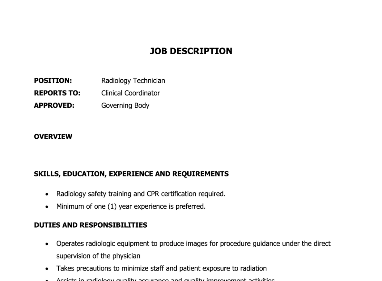 Radiologic Technologist Reports to. A Radiology Technicians responsibilities include explaining procedures to patients positioning them and equipment for imaging exams while maintaining a safe environment. Radiologic Technologist Job Description Position Title.